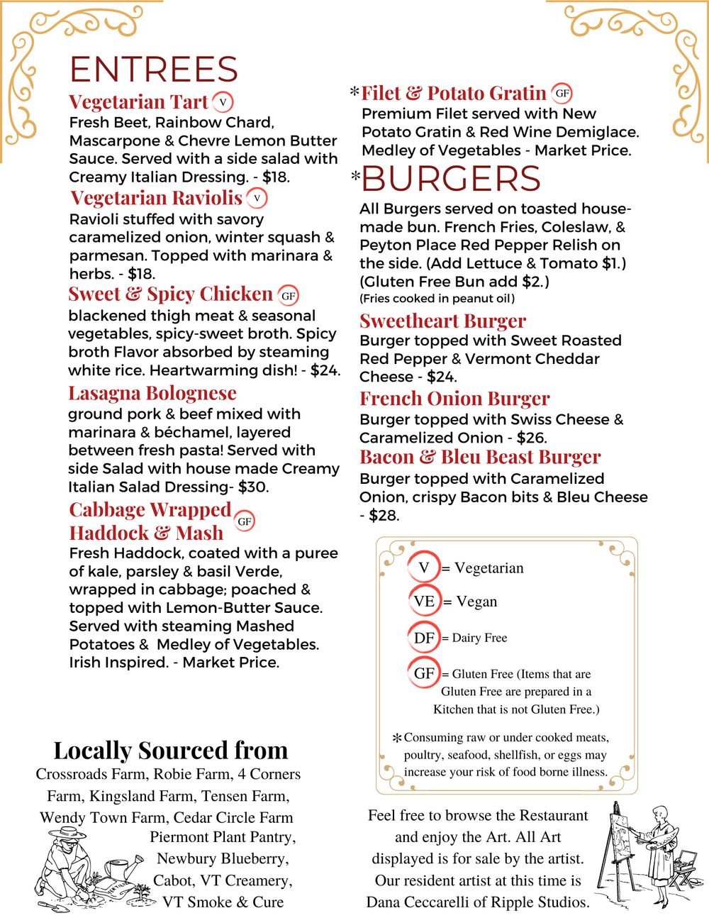 Dinner Menu Peyton Place Restaurant Orford New Hampshire Upper Valley Vermont Nh Lyme Hanover Fairlee Bradford Thetford